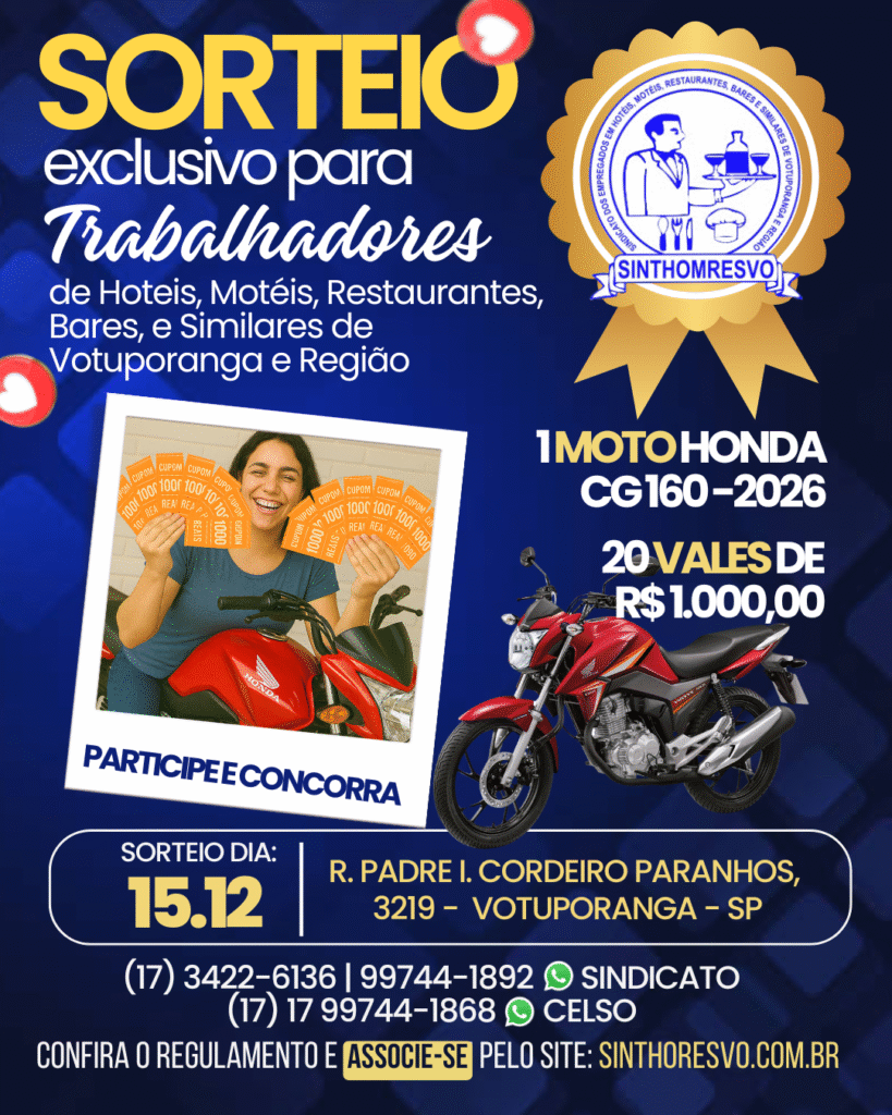 É com imenso prazer que o sindicato divulga o resultado do sorteio realizado pelo no dia 15/12, que premiou 01 Honda CG 160 – ano 2026 e 20 vales de…